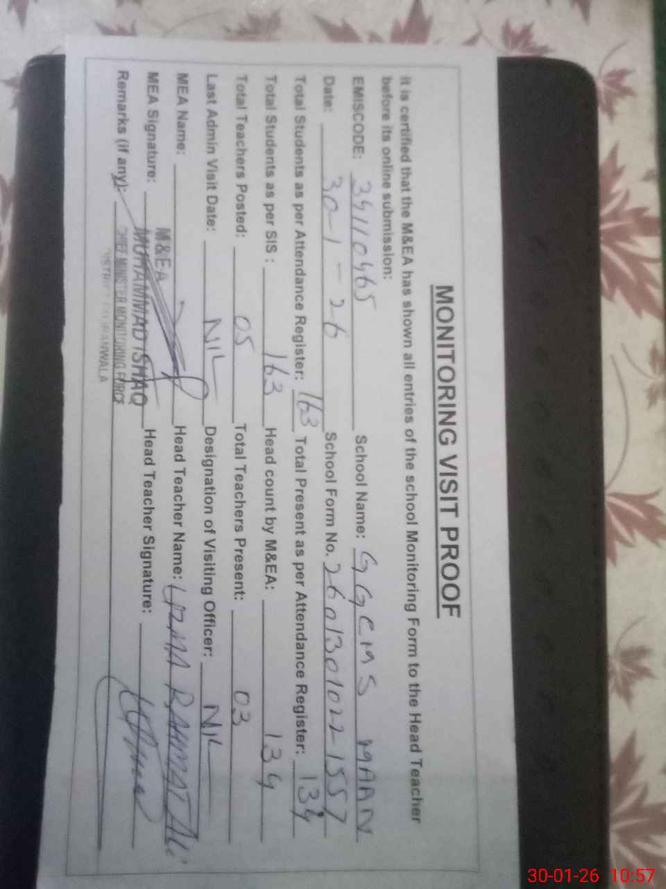 | Attendance Register | Head Teacher | MEA with School | Visit Proof |