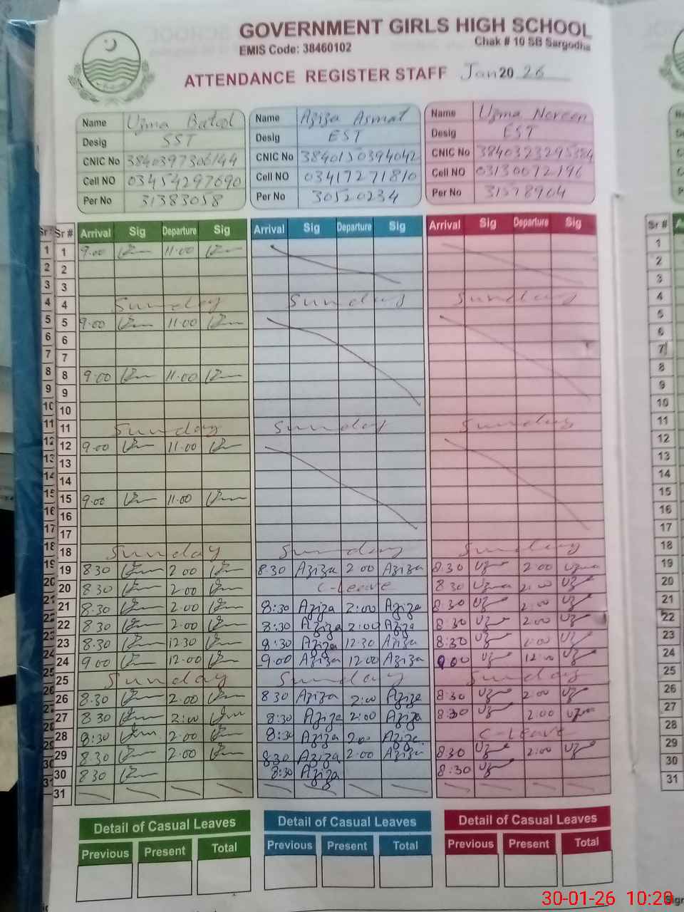 | CNIC | Full Name | Designation | R/C | Absence During Last Calender Month |