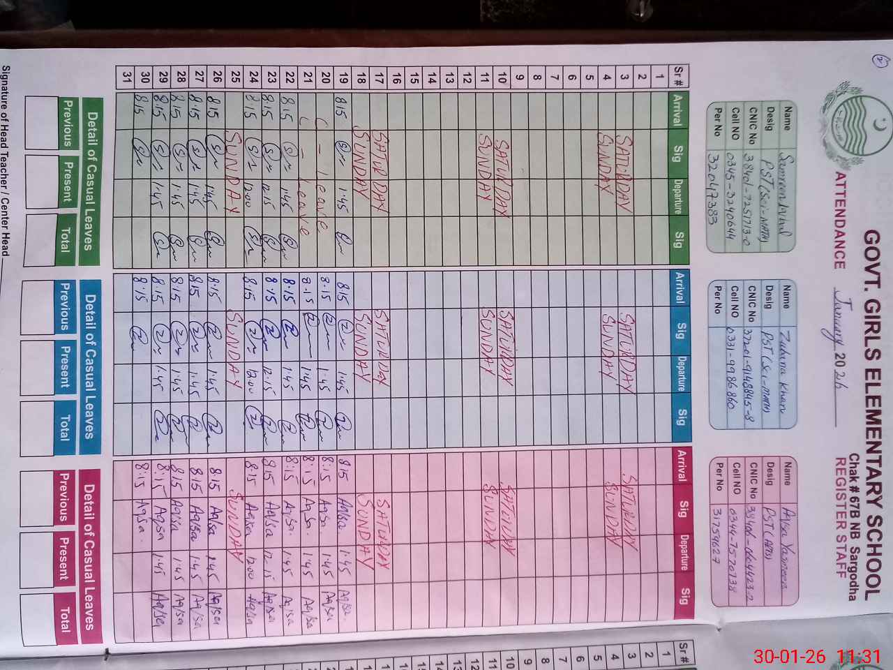 | CNIC | Full Name | Designation | R/C | Absence During Last Calender Month |