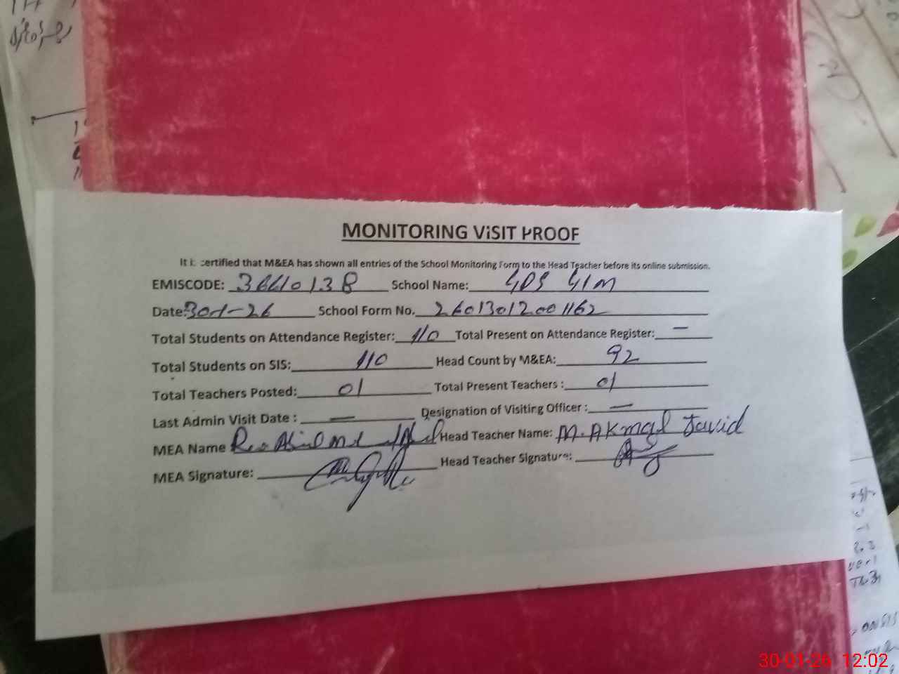 | Attendance Register | Head Teacher | MEA with School | Visit Proof |
