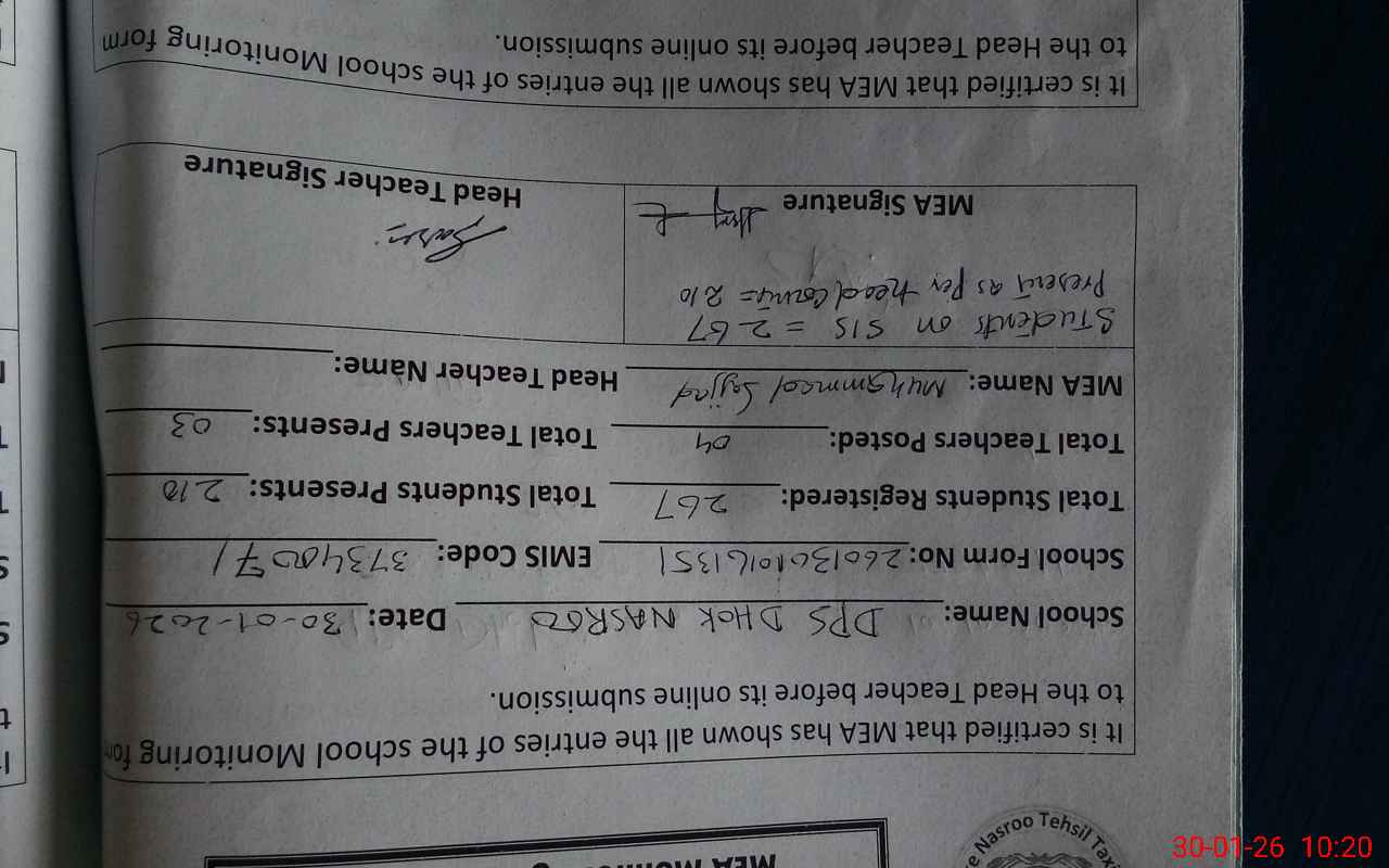 | Attendance Register | Head Teacher | MEA with School | Visit Proof |