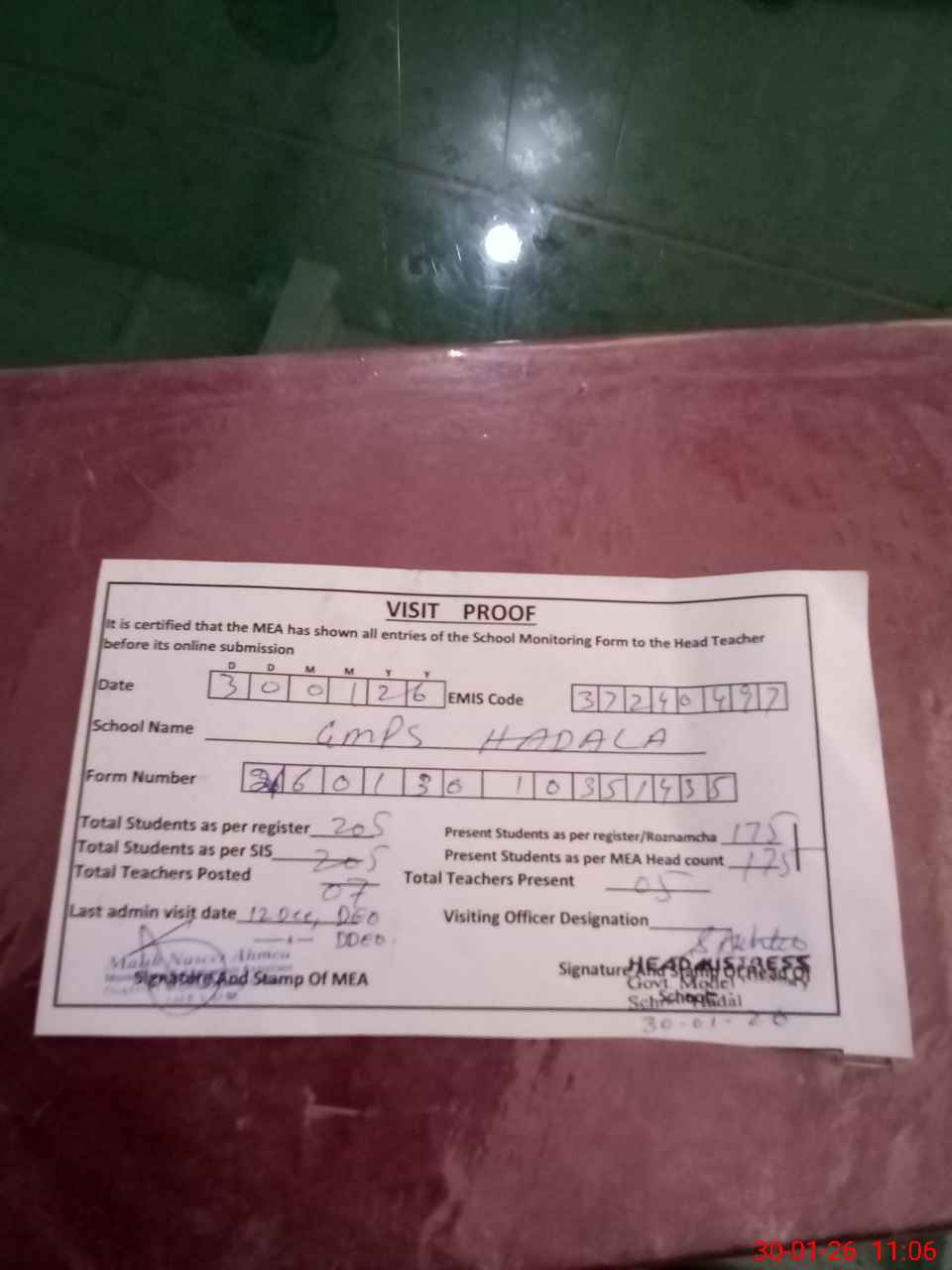| Attendance Register | Head Teacher | MEA with School | Visit Proof |