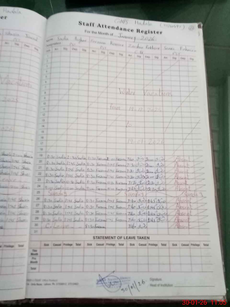 | Leave | Duty | Absent | Maternity | Medical | Ex- Pak |