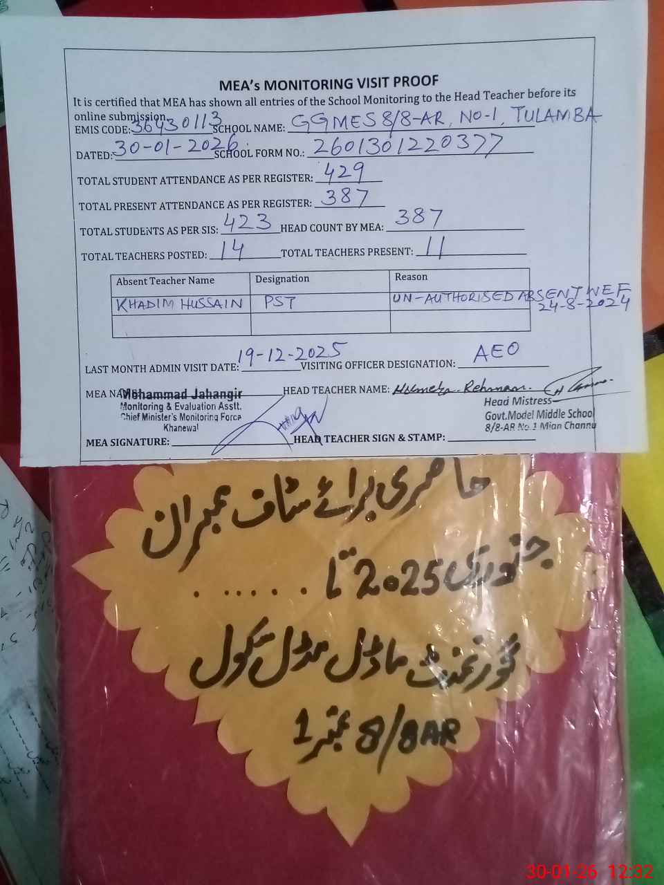 | EMIS Code: 36430113 | Name of School: GGMES 8/8-AR NO. 1, TULAMBA | |||