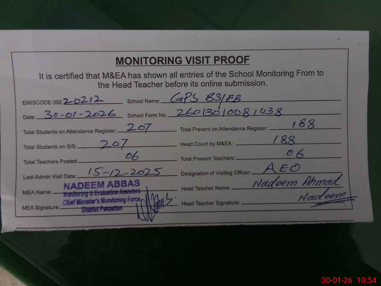 | Attendance Register | Head Teacher | MEA with School | Visit Proof |
