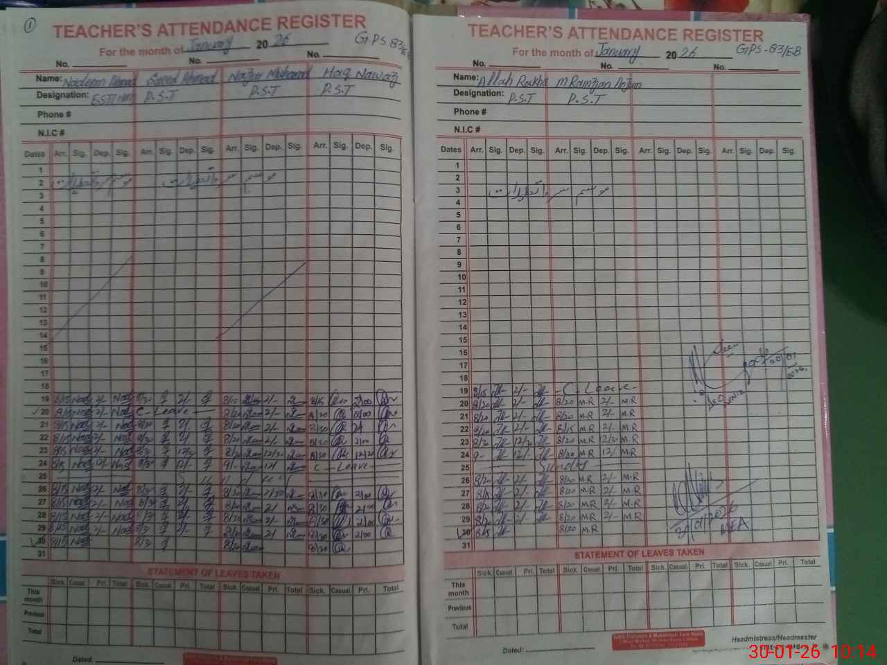 | CNIC | Full Name | Designation | R/C | Absence During Last Calender Month |