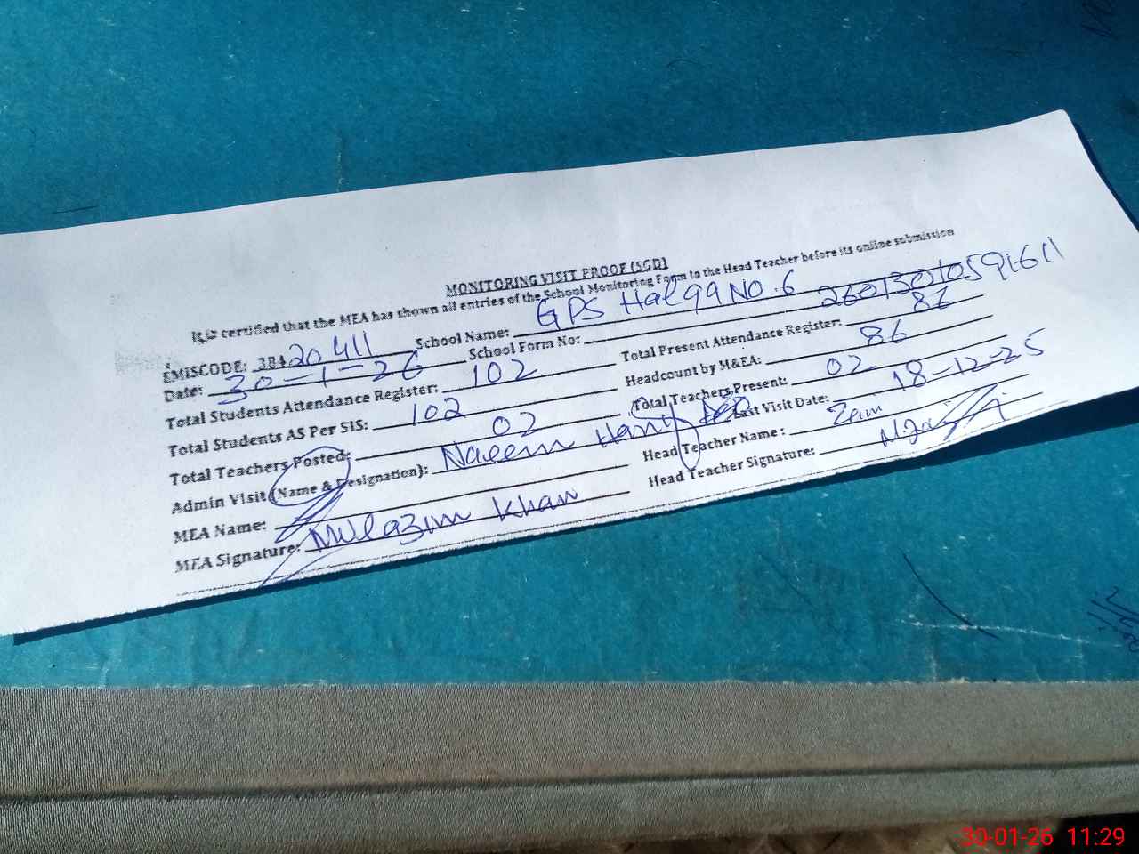 | Attendance Register | Head Teacher | MEA with School | Visit Proof |