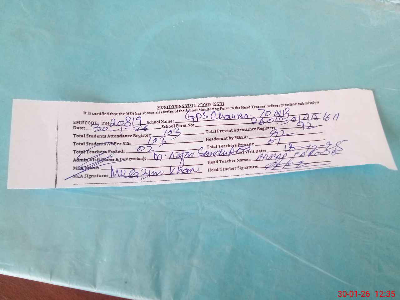 | Attendance Register | Head Teacher | MEA with School | Visit Proof |