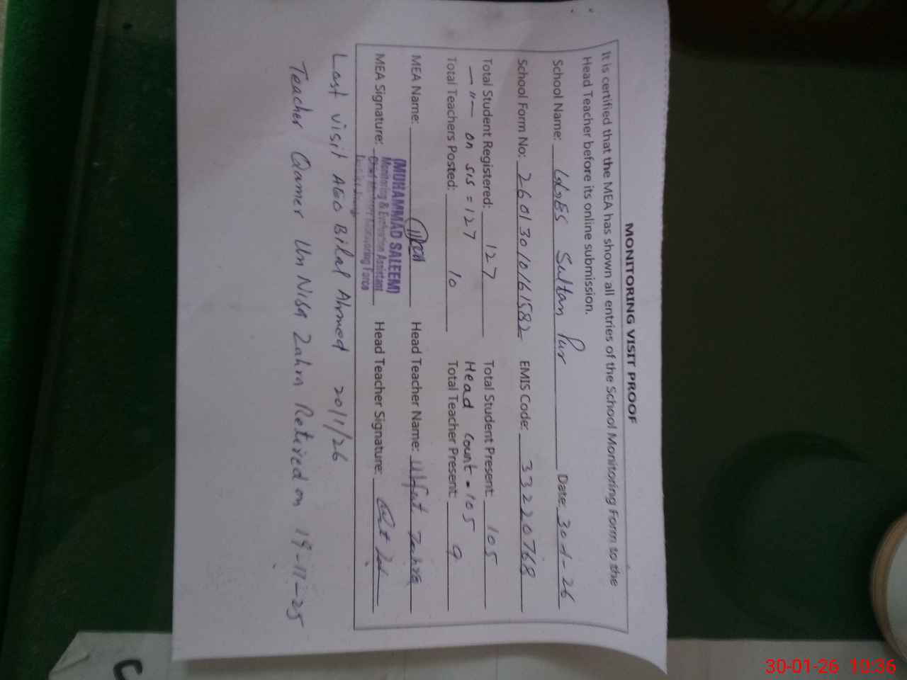 | Attendance Register | Head Teacher | MEA with School | Visit Proof |