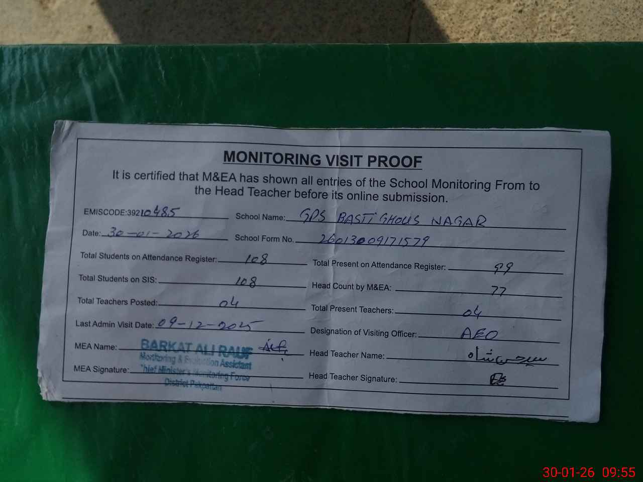 | Attendance Register | Head Teacher | MEA with School | Visit Proof |