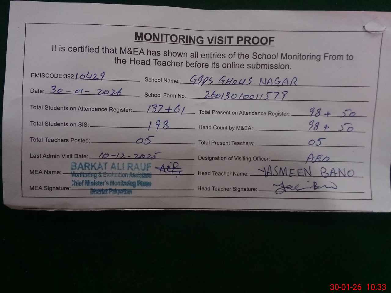| Attendance Register | Head Teacher | MEA with School | Visit Proof |