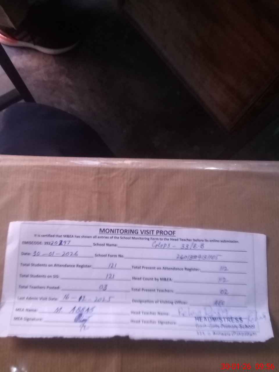 | Attendance Register | Head Teacher | MEA with School | Visit Proof |