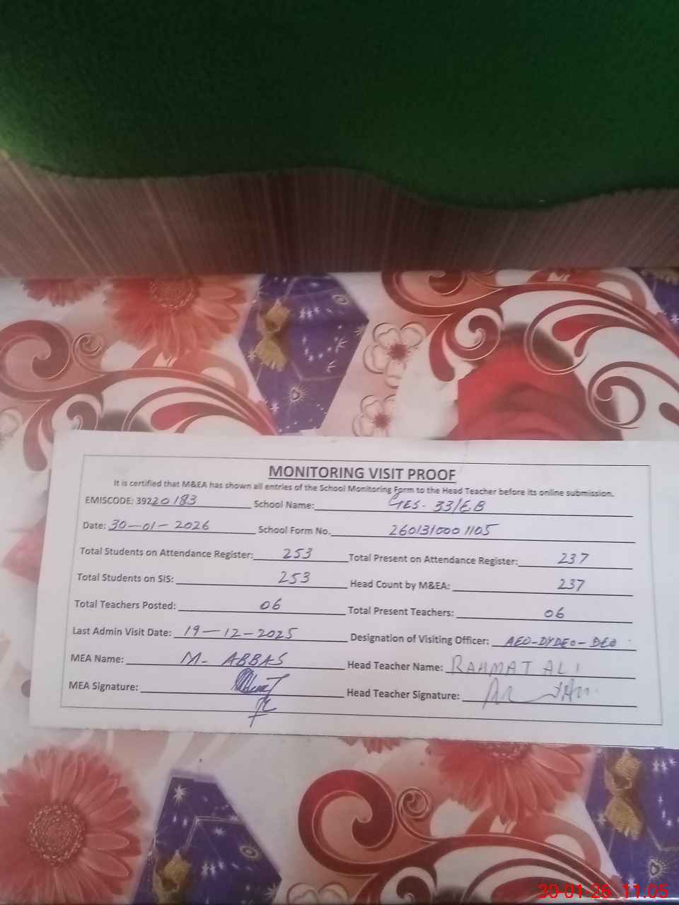 | Attendance Register | Head Teacher | MEA with School | Visit Proof |