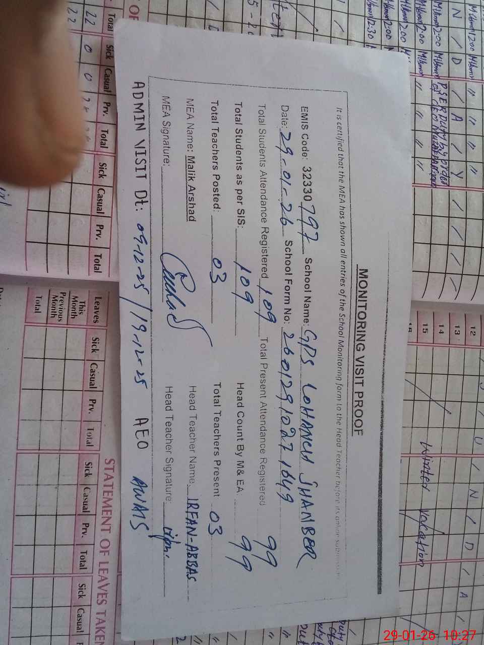 | Attendance Register | Head Teacher | MEA with School | Visit Proof |