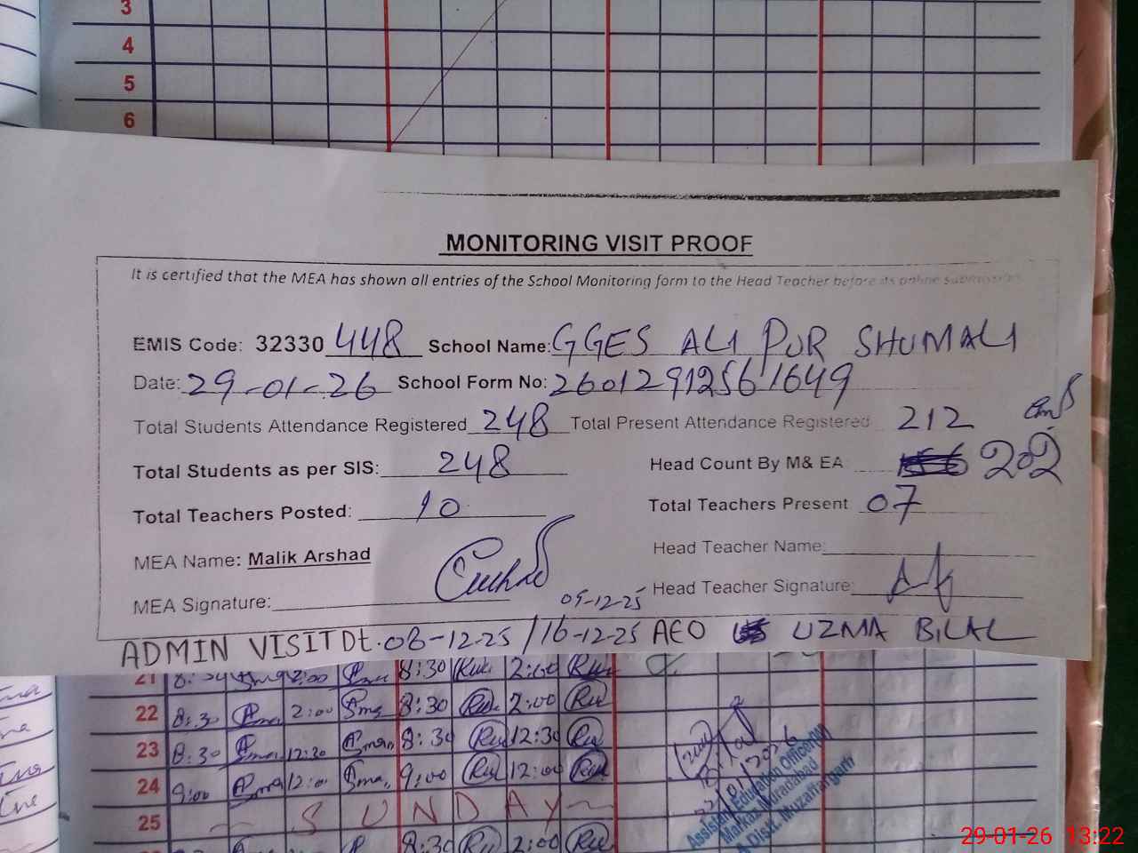| Attendance Register | Head Teacher | MEA with School | Visit Proof |