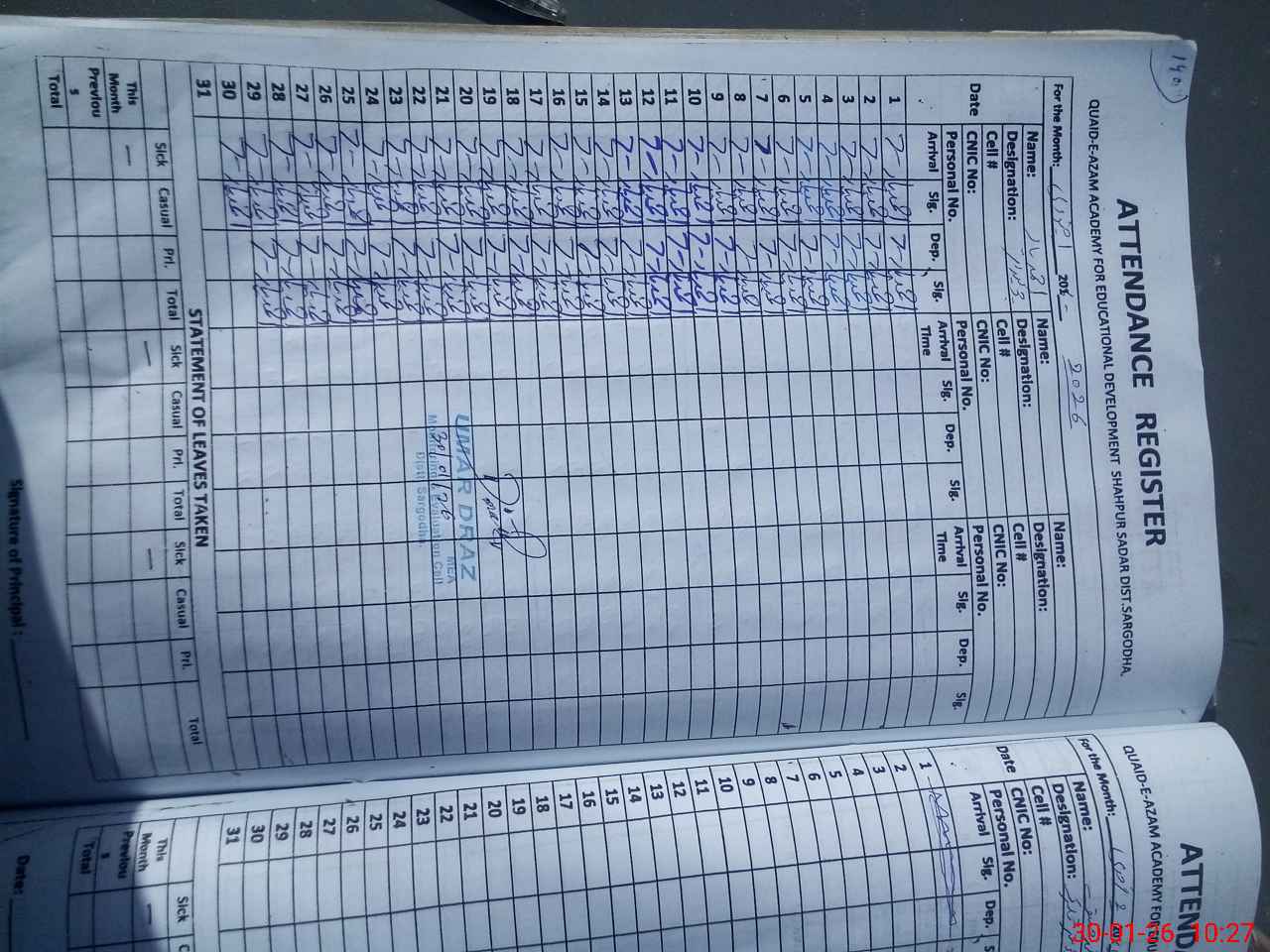 | CNIC | Full Name | Designation | R/C | Absence During Last Calender Month |