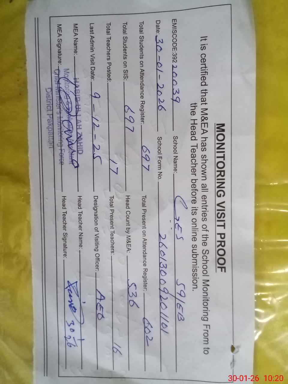 | Attendance Register | Head Teacher | MEA with School | Visit Proof |