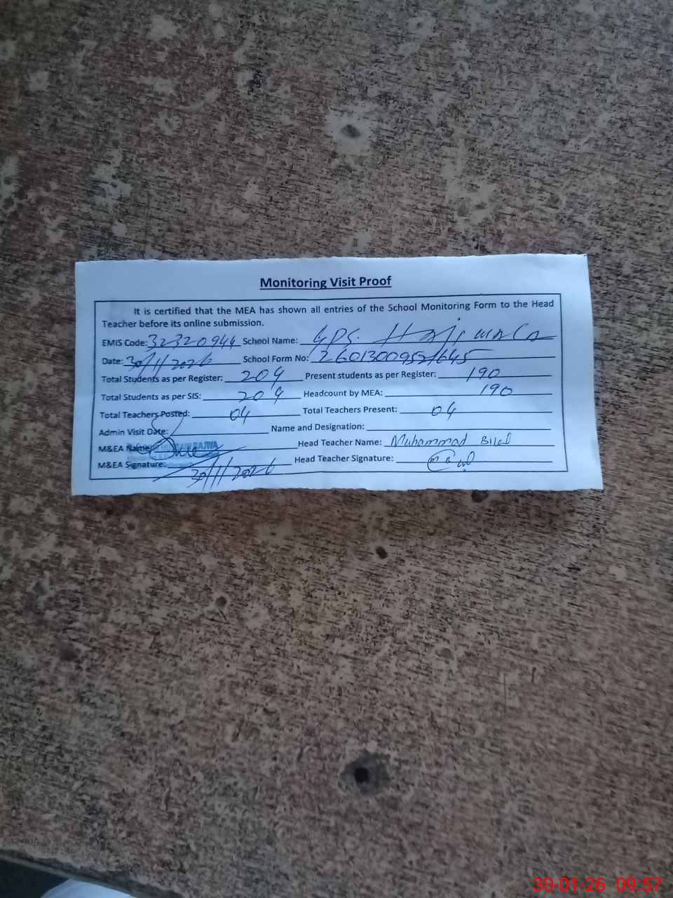 | Attendance Register | Head Teacher | MEA with School | Visit Proof |