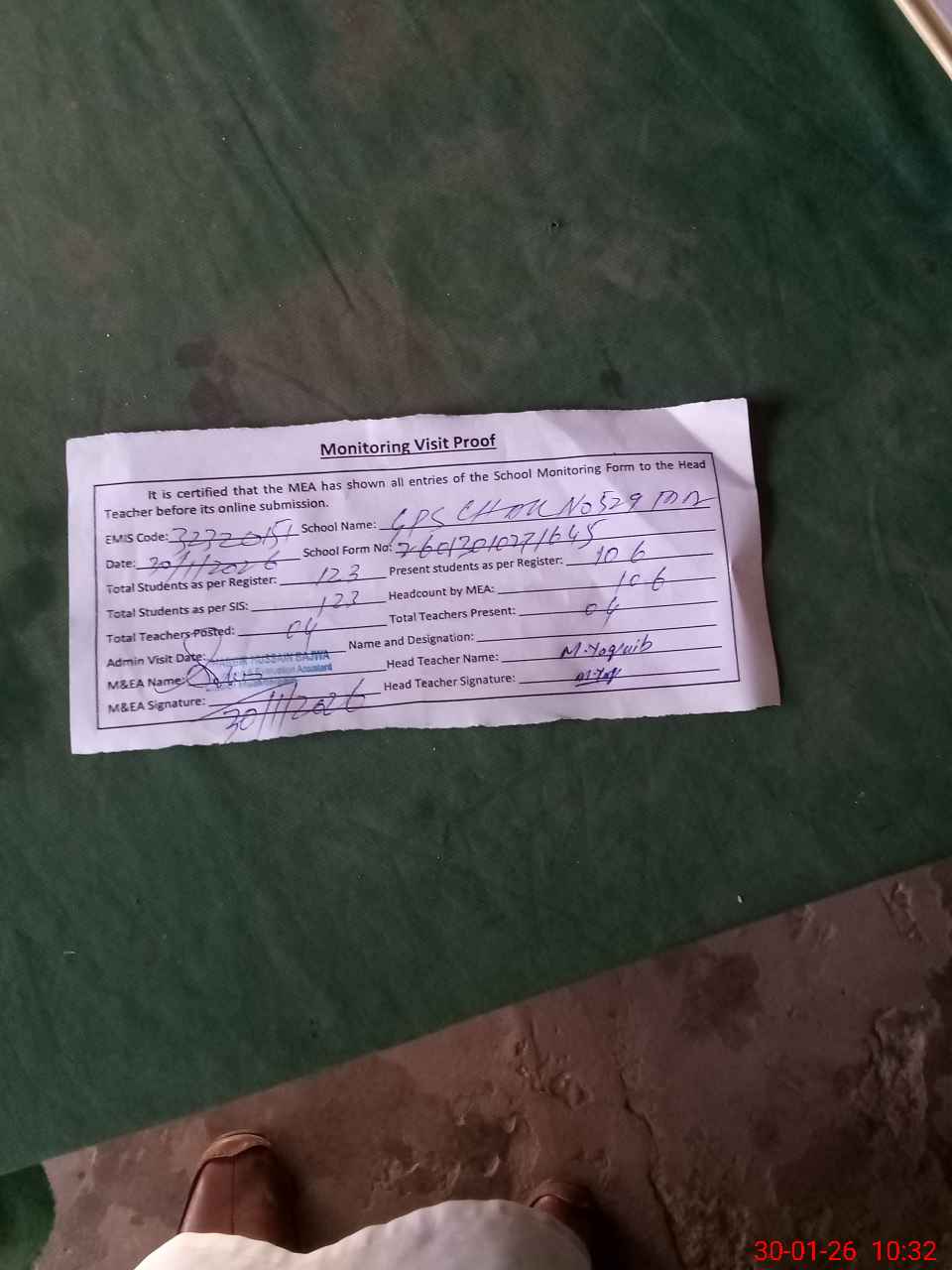 | Attendance Register | Head Teacher | MEA with School | Visit Proof |