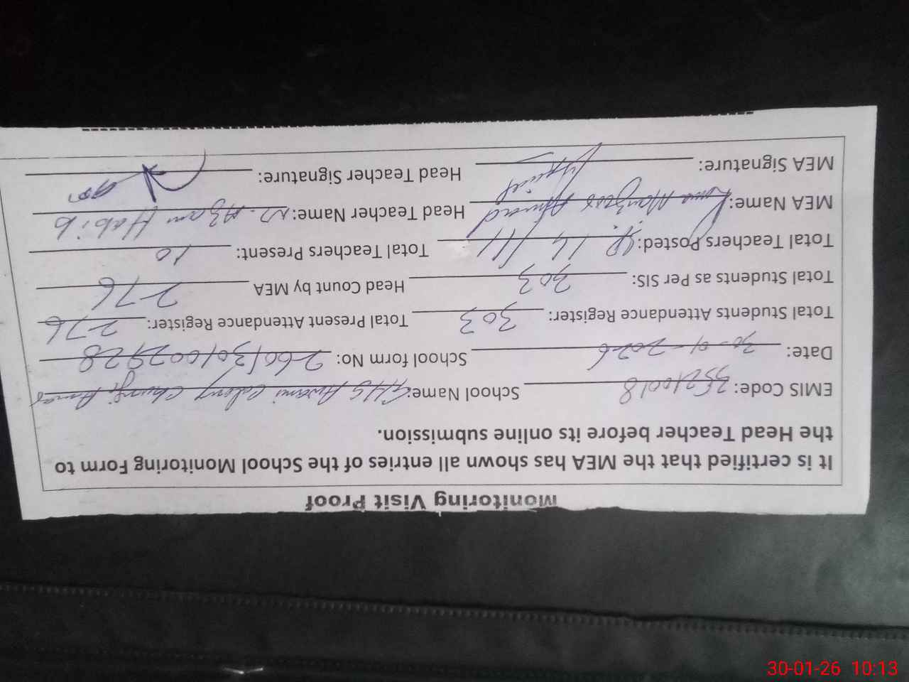 | Attendance Register | Head Teacher | MEA with School | Visit Proof |