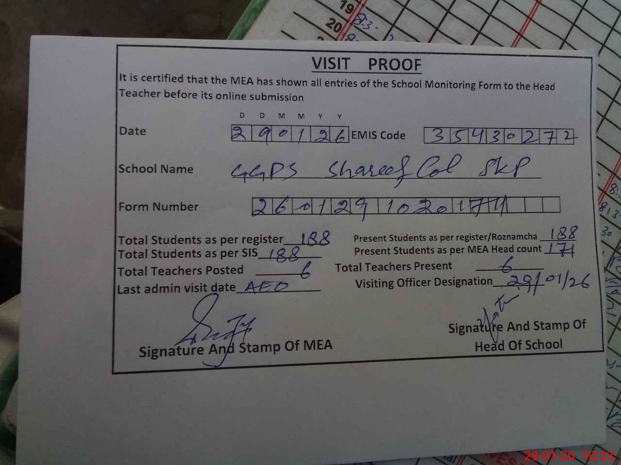 | Attendance Register | Head Teacher | MEA with School | Visit Proof |