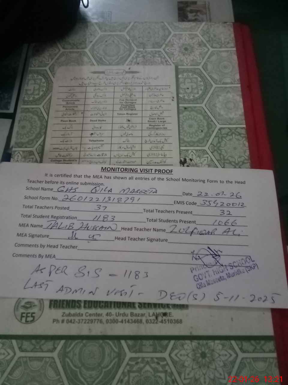 | EMIS Code: 35420012 | Name of School: GHS QILA MASSETAH MURIDKE | |||