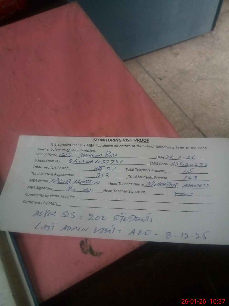 | Attendance Register | Head Teacher | MEA with School | Visit Proof |