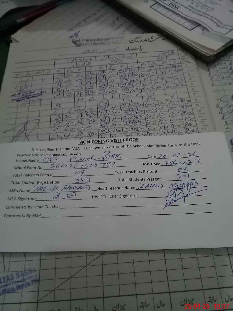 | Attendance Register | Head Teacher | MEA with School | Visit Proof |