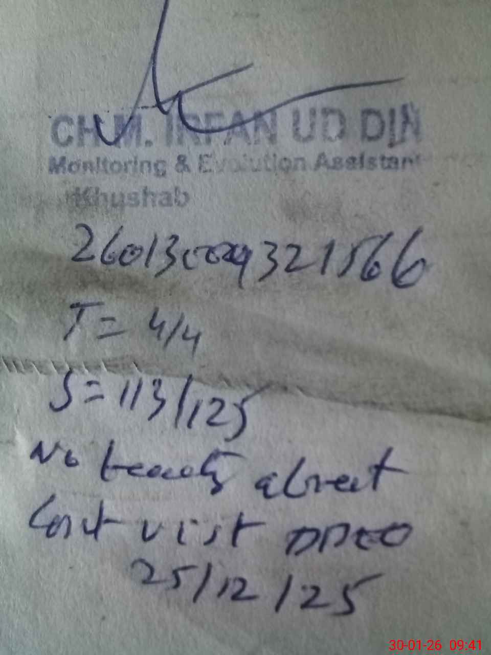 | Remarks (Use Separate Page if Required): gps khanay khail student on sis 125 student on register 125 head count 113 no teacher absent last visit ddeo 25/12/25 | |||||