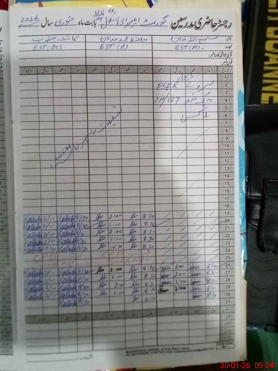 | CNIC | Full Name | Designation | R/C | Absence During Last Calender Month |