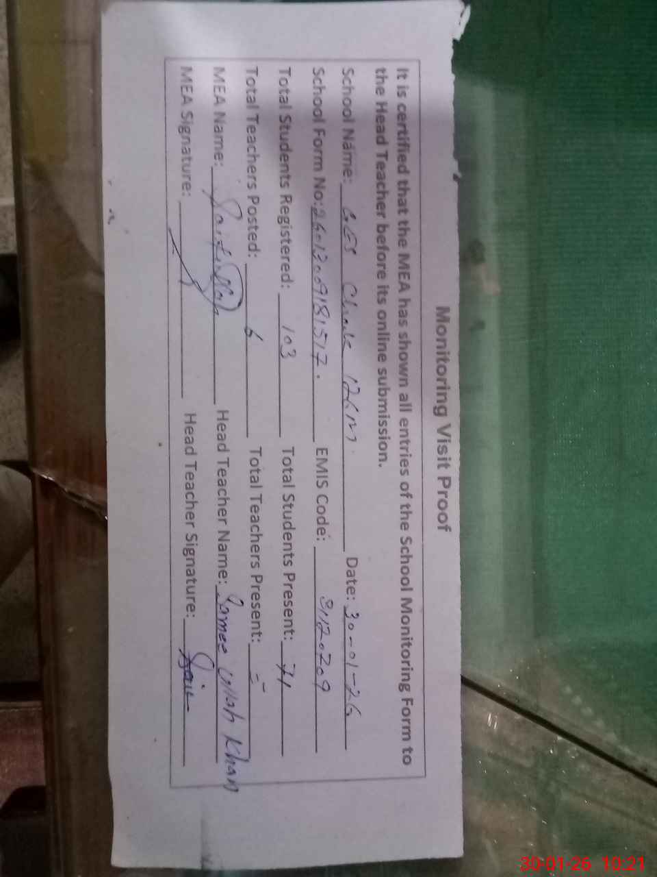 | Attendance Register | Head Teacher | MEA with School | Visit Proof |