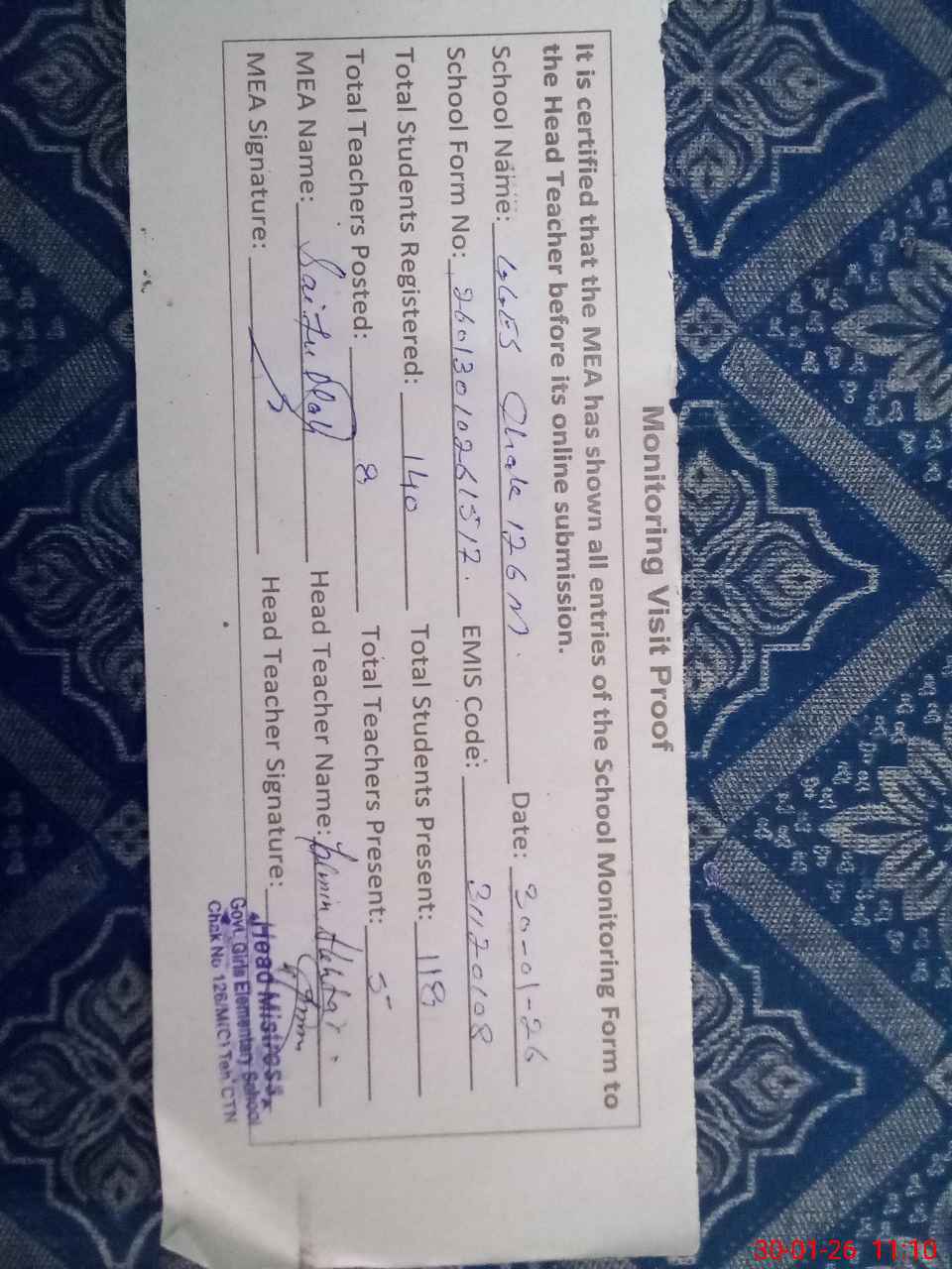 | Attendance Register | Head Teacher | MEA with School | Visit Proof |