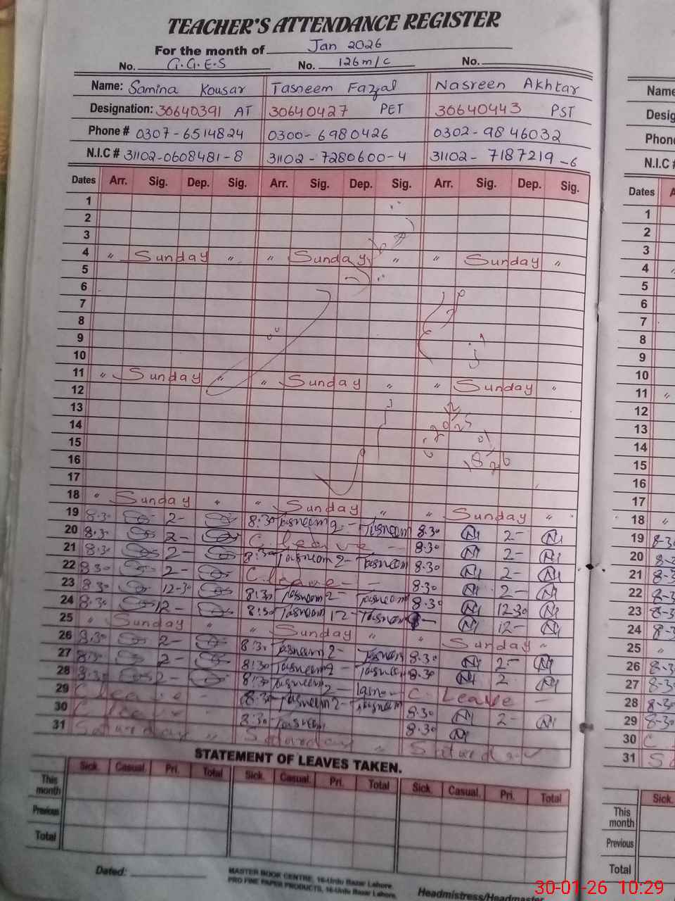| CNIC | Full Name | Designation | R/C | Absence During Last Calender Month |