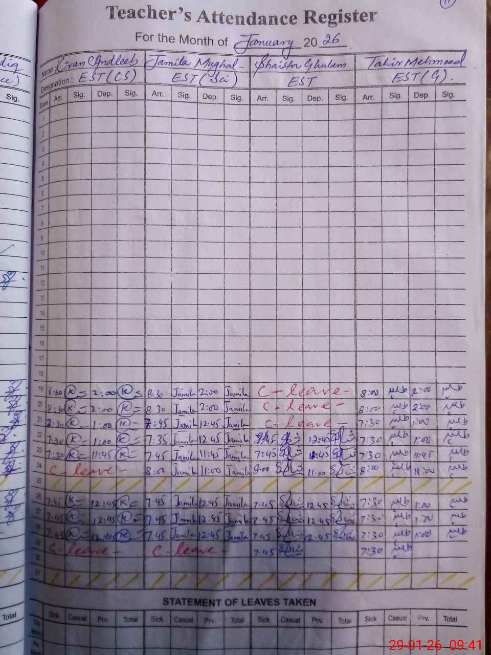 | CNIC | Full Name | Designation | R/C | Absence During Last Calender Month |