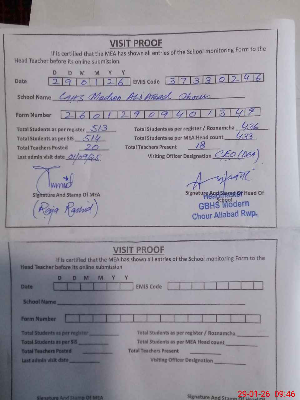 | Attendance Register | Head Teacher | MEA with School | Visit Proof |
