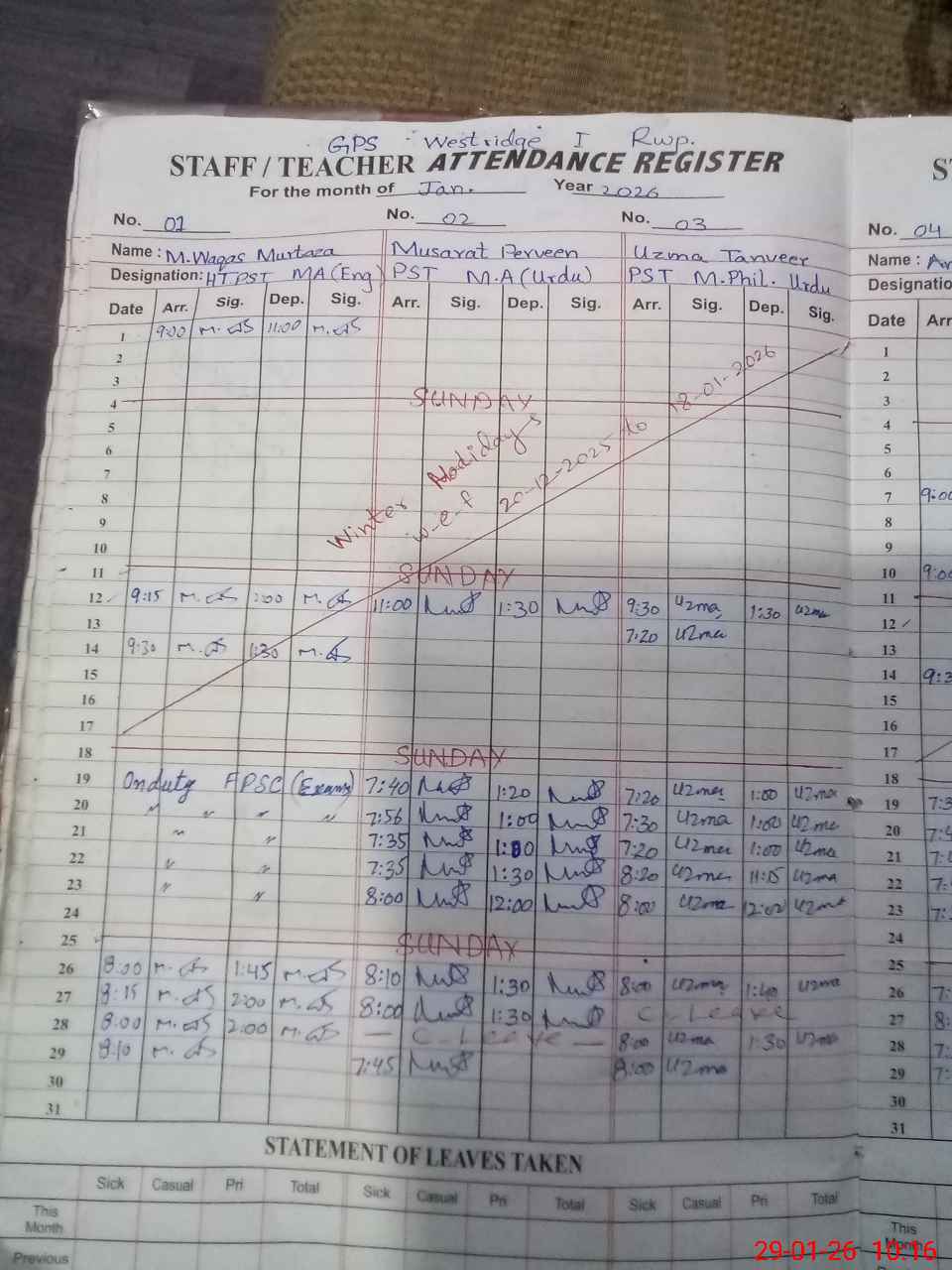 | Leave | Duty | Absent | Maternity | Medical | Ex- Pak |