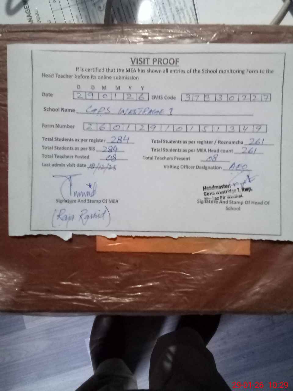 | Attendance Register | Head Teacher | MEA with School | Visit Proof |