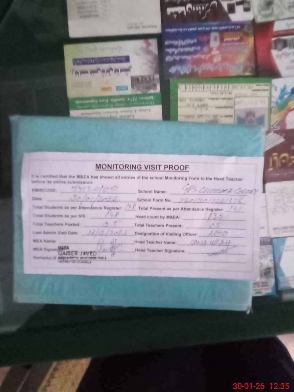 | Attendance Register | Head Teacher | MEA with School | Visit Proof |