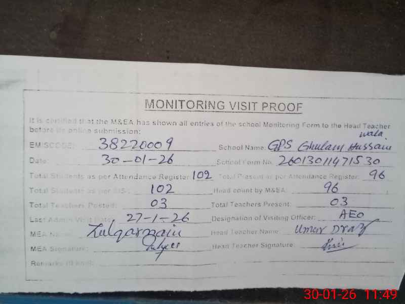 | EMIS Code: 38220009 | Name of School: GPS GHULAM HUSSAIN WALA | |||