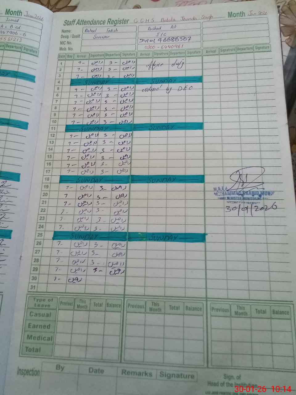| CNIC | Full Name | Designation | R/C | Absence During Last Calender Month |