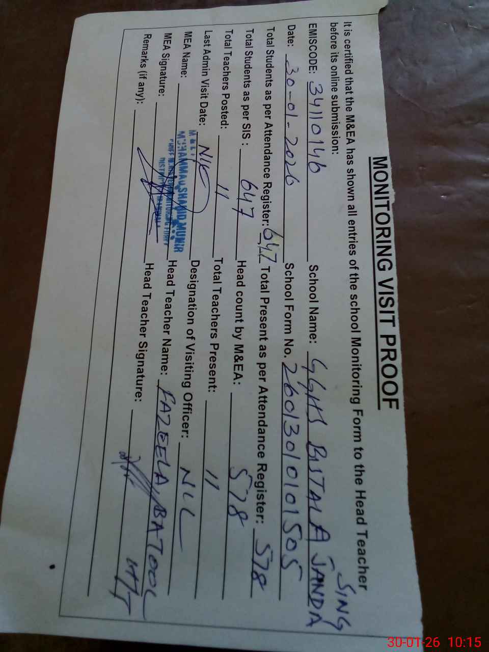 | Attendance Register | Head Teacher | MEA with School | Visit Proof |