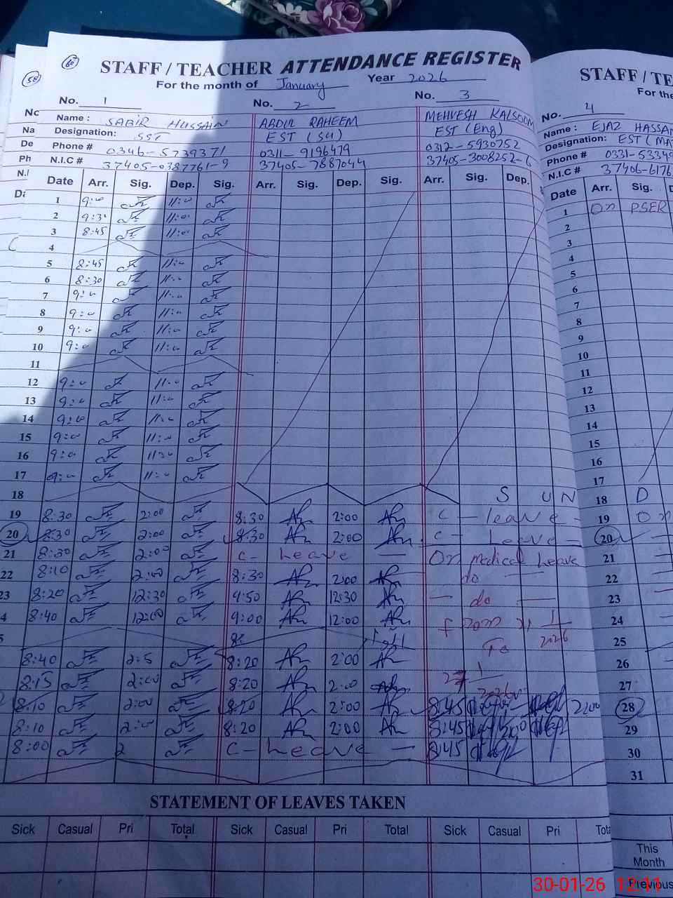 | CNIC | Full Name | Designation | R/C | Absence during last cal. month |
