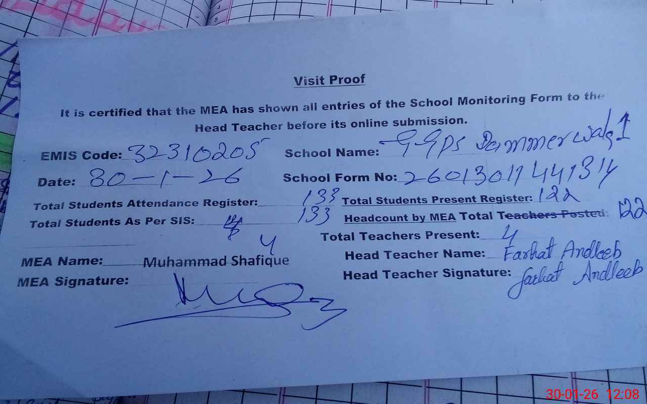 | Attendance Register | Head Teacher | MEA with School | Visit Proof |