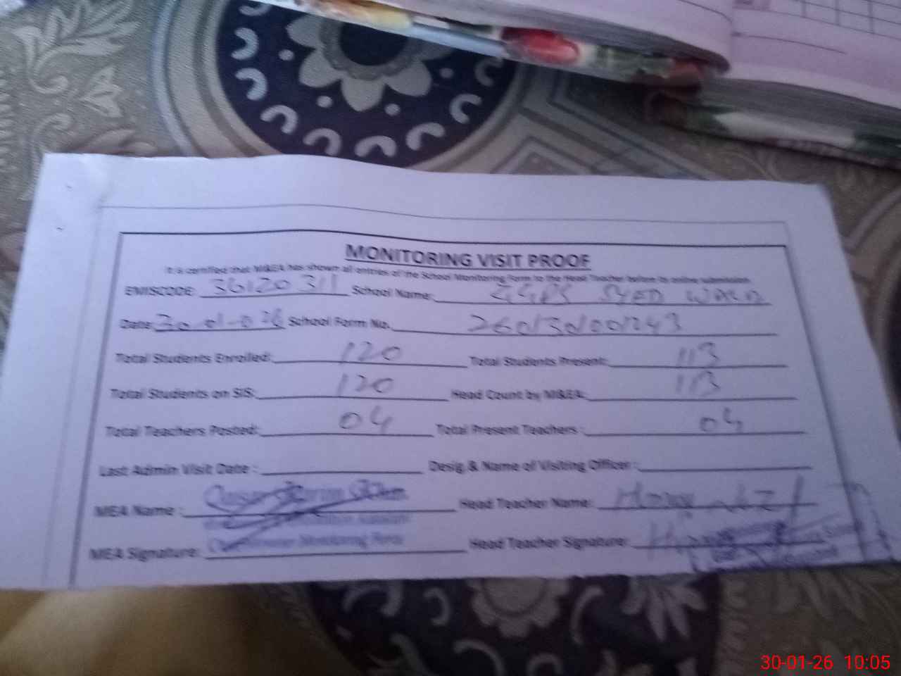 | Attendance Register | Head Teacher | MEA with School | Visit Proof |