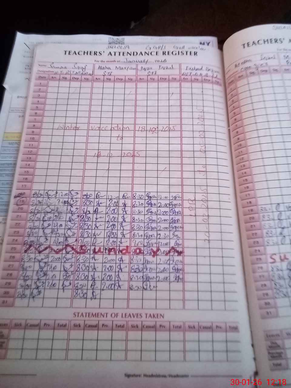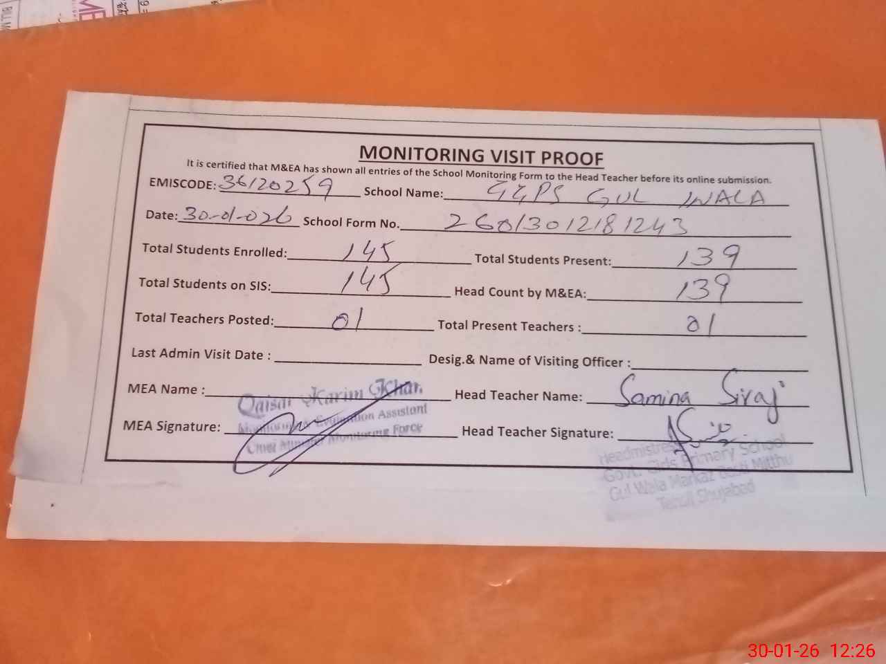 | Attendance Register | Head Teacher | MEA with School | Visit Proof |