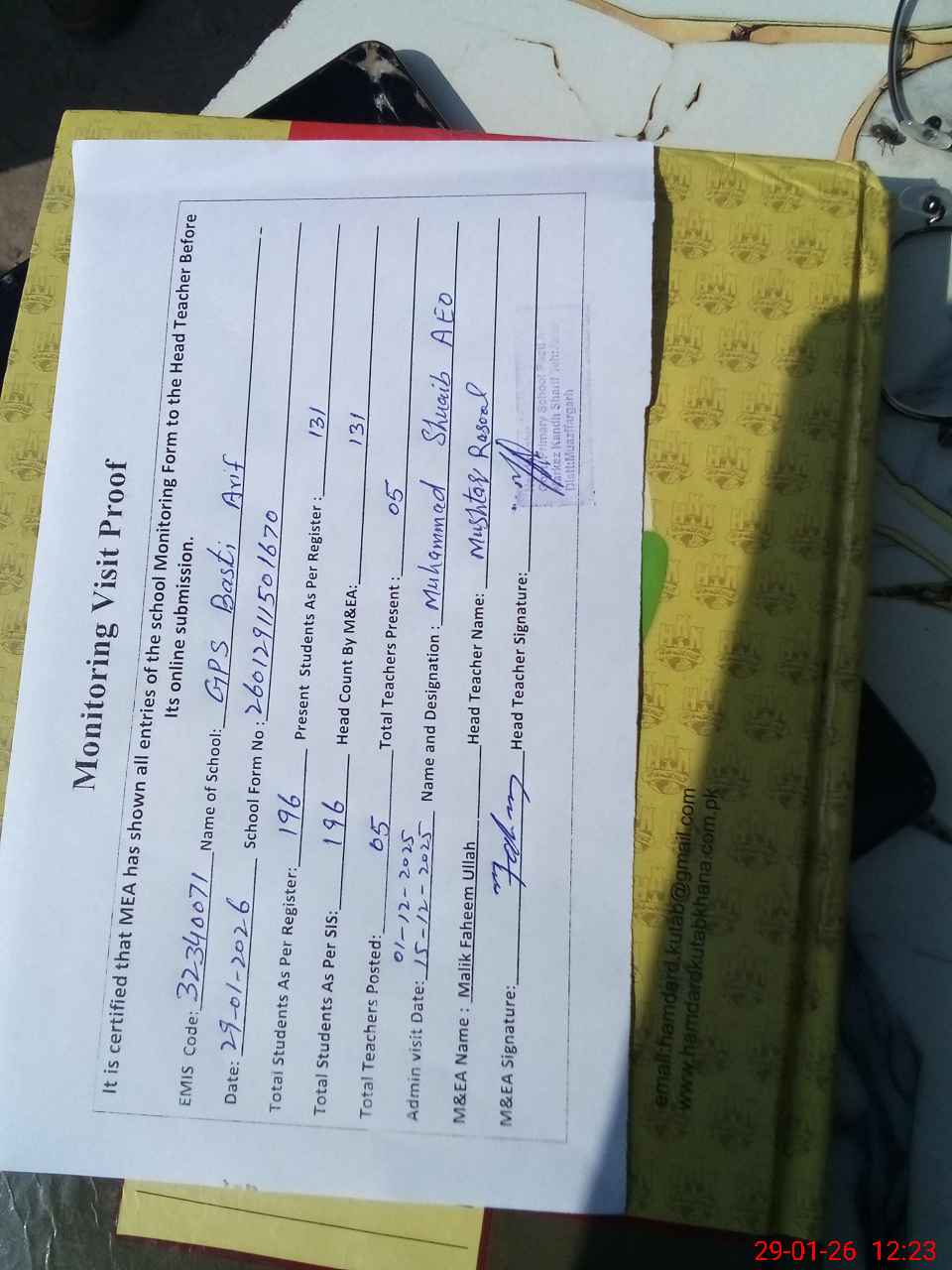 | Attendance Register | Head Teacher | MEA with School | Visit Proof |