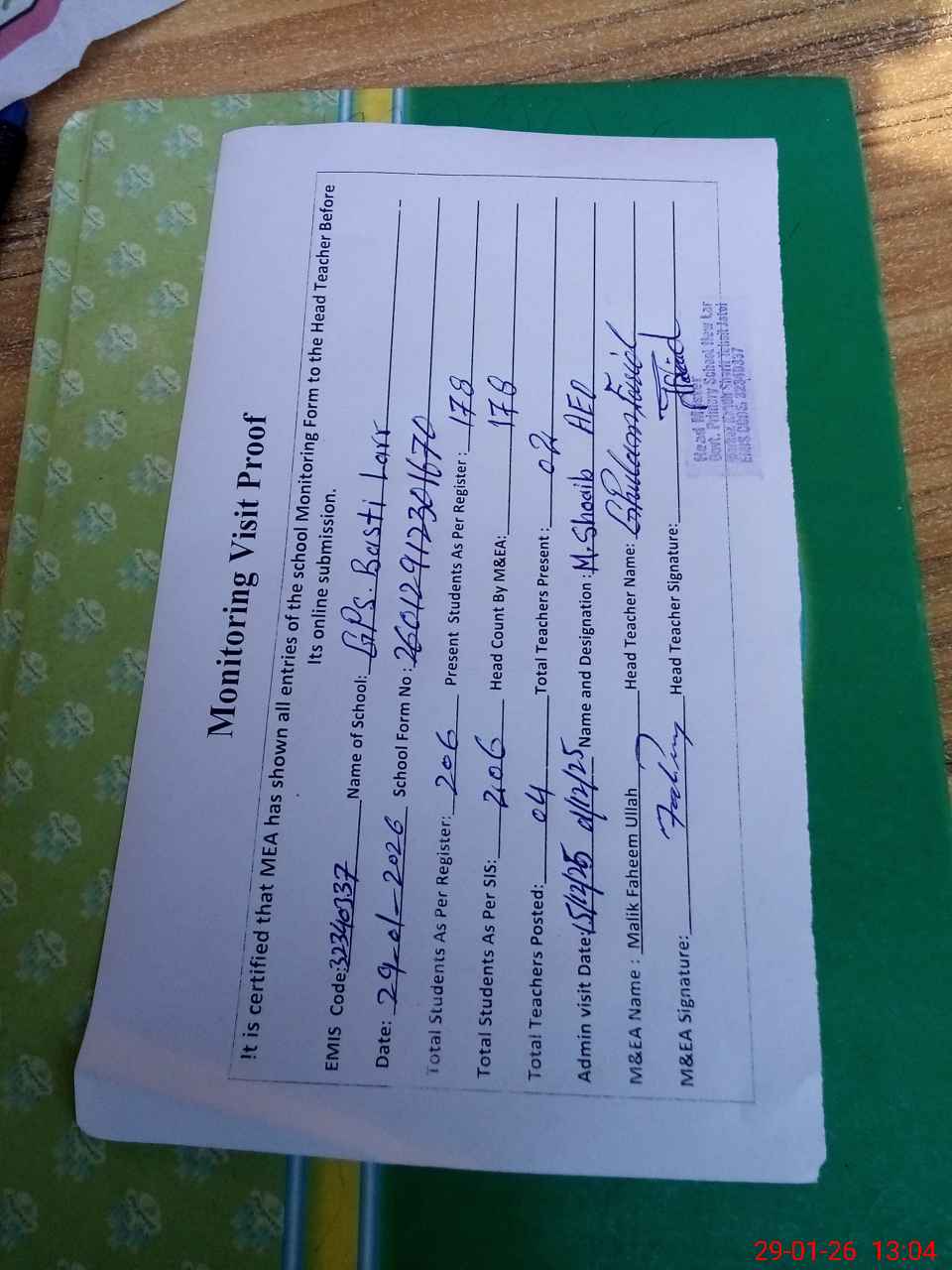 | Attendance Register | Head Teacher | MEA with School | Visit Proof |