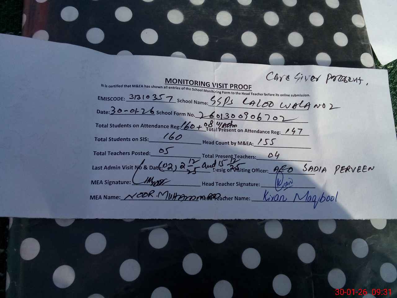 | Attendance Register | Head Teacher | MEA with School | Visit Proof |