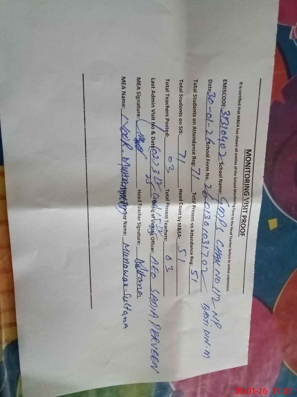 | Name: MU**** SU**** Designation: (School Headmaster's/Headmistress's) PST Phone/Cell Number: 03**** |