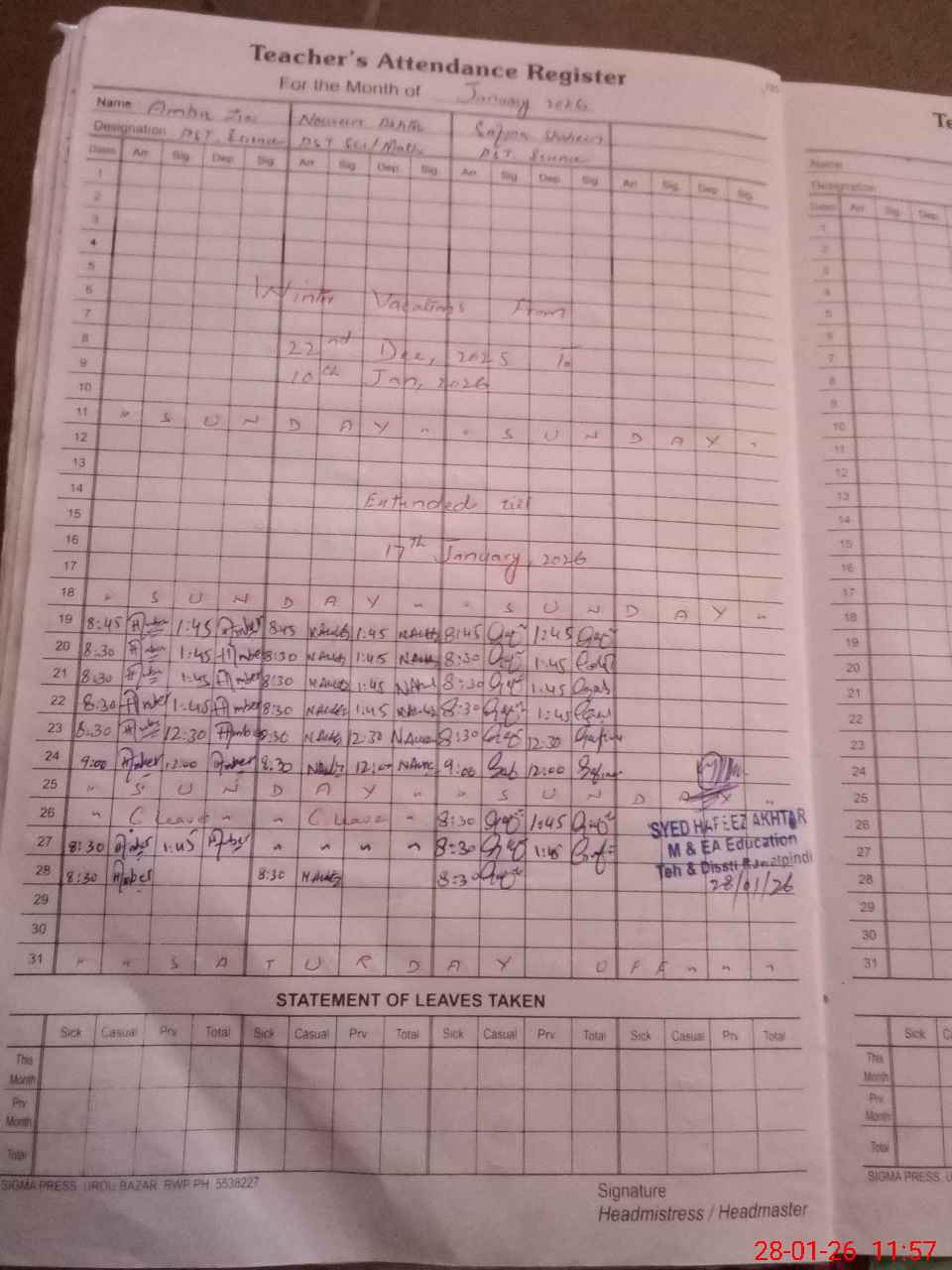 | Remarks (Use Separate Page if Required): Naib Qasid Assalam Mehmood is attached in and present in school today | |||||